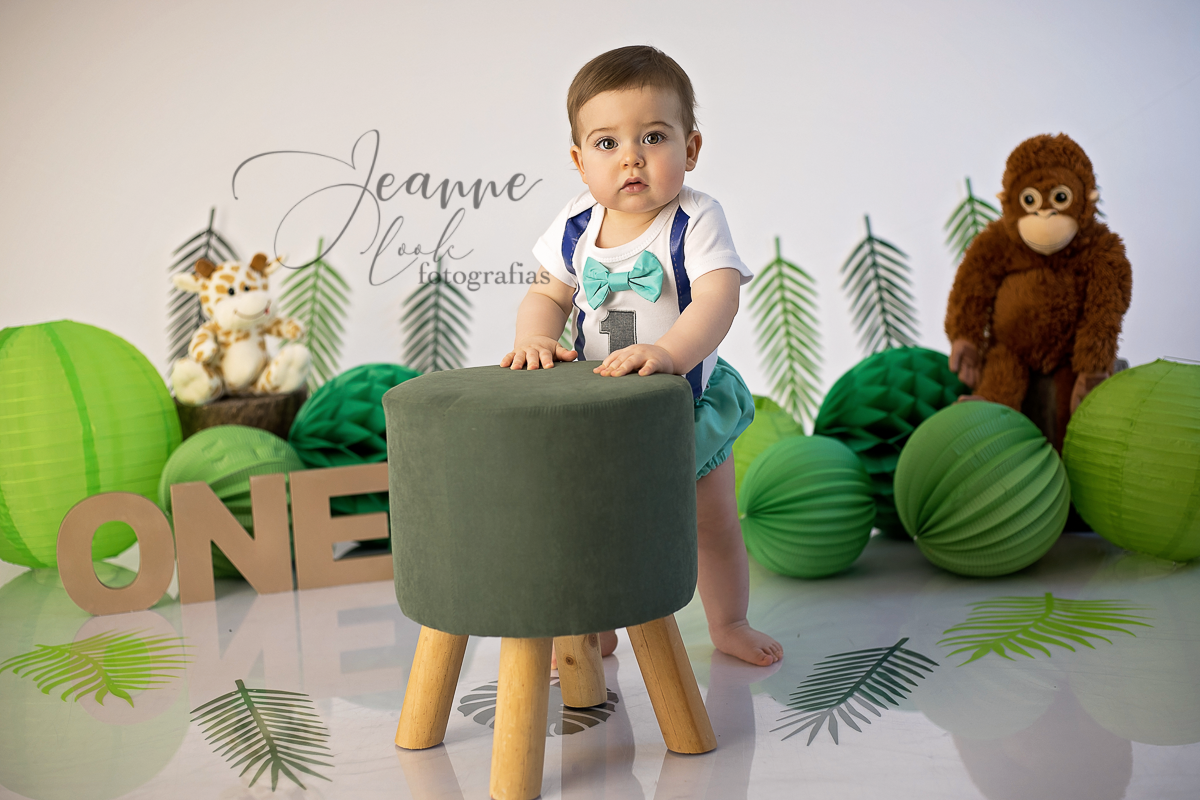 O tema da festinha do pequeno foi safari, então trabalhamos em cima das cores e a mamã trouxe uns peluches para decorar o cenário
